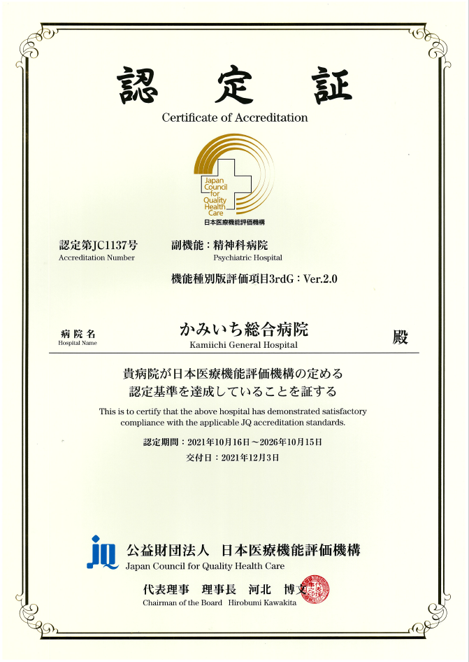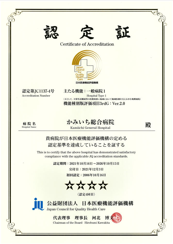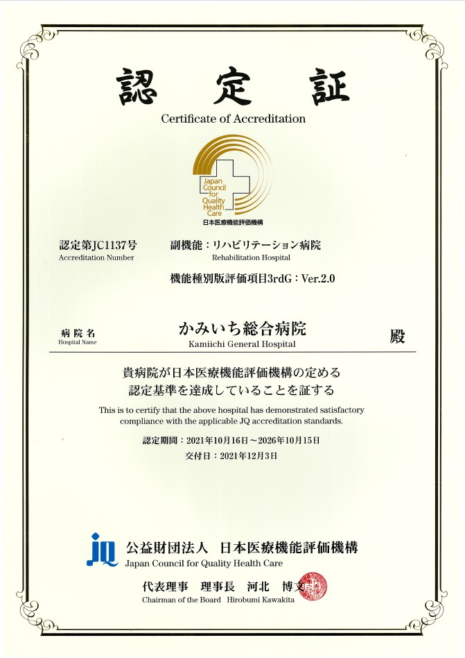 令和3年12月3日、かみいち総合病院は日本医療機能評価機構から一定の病院機能を有する病院として評価され、「機能種別版3rdG:Ver.2.0」を取得し、同機構の認定病院の継続が認められました。